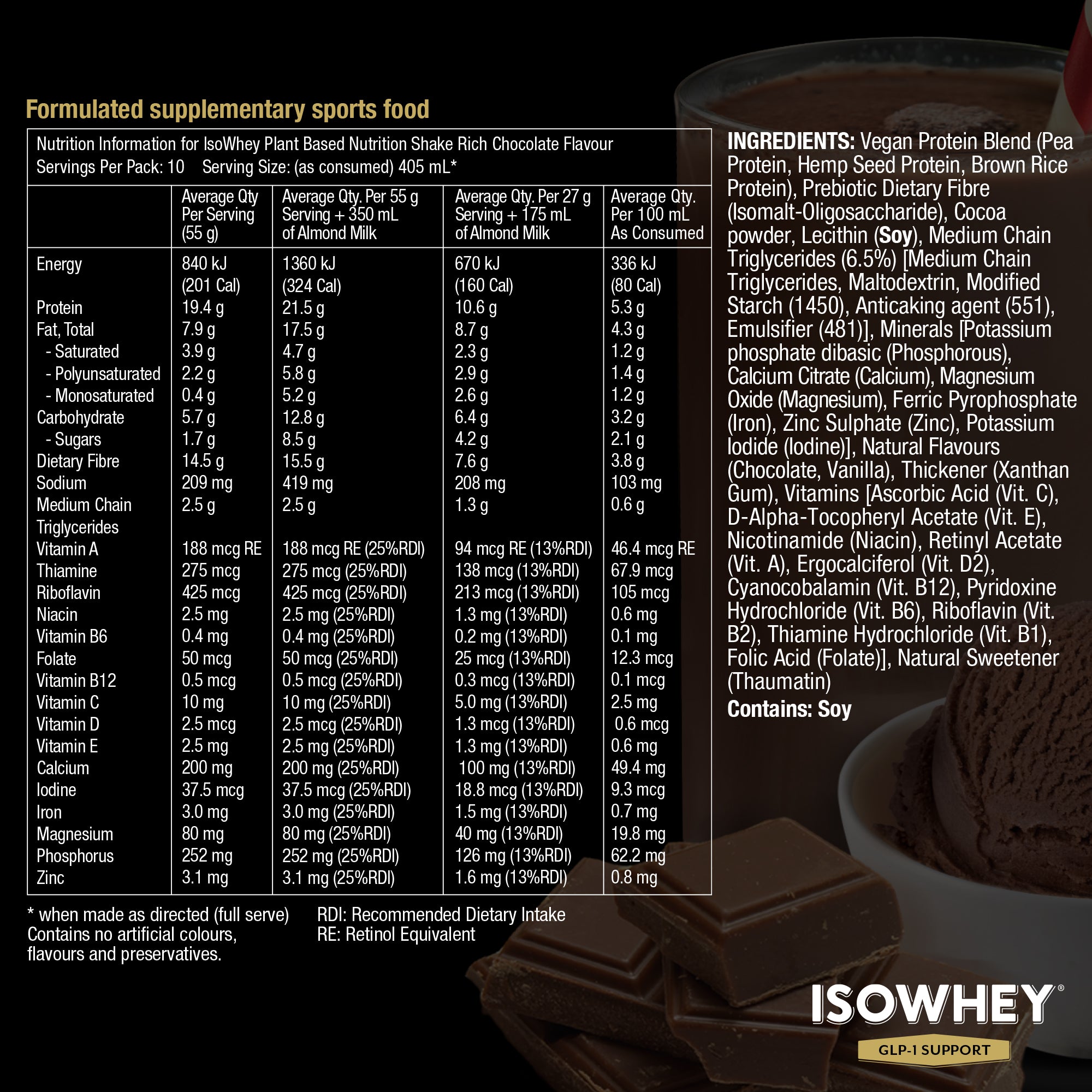 IsoWhey Plant-Based Nutrition Shake is made with a blend of pea, brown rice and hemp protein that means you get a deliciously smooth shake with no grassy taste or smell. With 21g of protein per serve* to help preserve muscle mass, 16g of fibre to help support digestion and promote gut health and 16 vitamins and minerals to support your energy production!